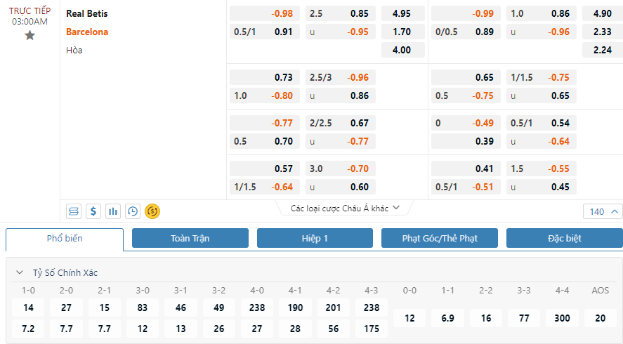 Ở bảng kèo tỷ số chính của trận đấu tỷ số 0-1 đang có điểm ăn thấp nhất là 7.2, tiếp theo tỷ số 0-2 có mức ăn không quá chênh lệch là 0-2. Với dự đoán Barcelona thắng kèo và trận đấu không có nhiều bàn thắng được ghi. Thì lựa chọn tỷ số 0-1 hoặc 0-2 sẽ là lựa chọn tỷ số tối ưu nhất cho trận đấu này