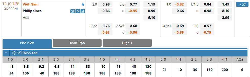 Trên sàn giao dịch châu Á hiện tại ĐT Việt Nam đang có tỷ lệ chấp 2 hoà, đây là mức chấp cao nhất của đội bóng áo đỏ khi đối đầu với Philippines kể từ năm 2010. Điều này cho thấy giới chuyên môn đang đánh giá rất cao khả năng thắng đậm của ĐT Việt Nam