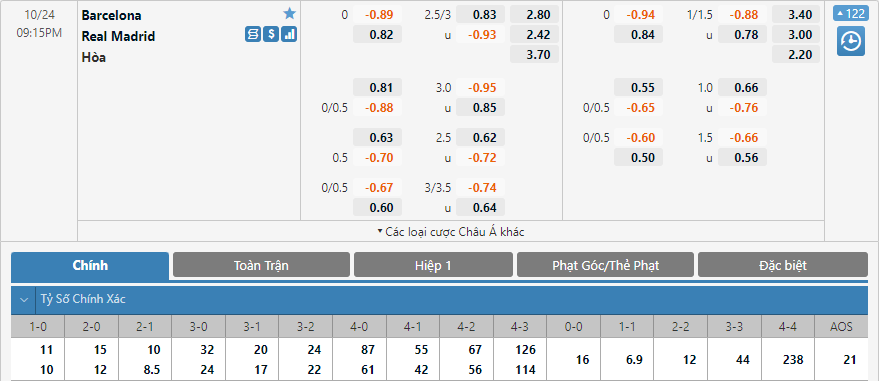 Ở bảng kèo tỷ số chính xác của trận đấu tỷ số hoà 1-1 đang có điểm ăn thấp nhất với 6.9 lần. Tiếp theo là tỷ số 1-2 với mức ăn 8.5 lần, tỷ số 2-1 và 0-1 có cũng có điểm ăn không quá chênh lệch với 10 lần. Với dự đoán Real Madrid có nhiều cơ hội giành chiến thắng trận này và trận đấu sẽ diễn ra sôi nổi với nhiều bàn thắng được ghi thì lựa chọn tỷ số 1-2 hoặc 1-3 sẽ là lựa chọn hợp lý.