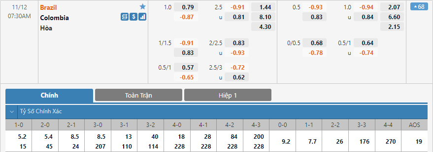 Trên sàn giao dịch hiện tại tỷ số 1-0 có điểm ăn thấp nhất với 5.2 lần, tiếp theo là tỷ số 2-0 với 5.4 lần. Tỷ số hoà 1-1 cũng không có sự chênh lệch lớn với 7.7 lần. Điều này có thể thấy nhà cái châu Á cũng đang nghiêng về kết quả xỉu. Với dự đoán Brazil sẽ giành chiến thắng nhưng không mấy dễ dàng thì tỷ số 1-0 hoặc 2-0 là những lựa chọn phù hợp.