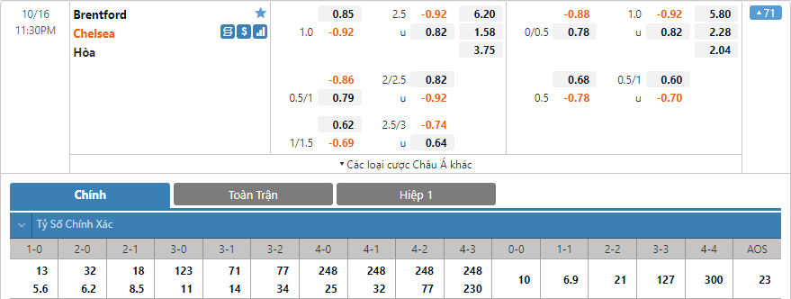 Trên sàn giao dịch châu Á Chelsea đang có tỷ lệ chấp 1 hòa và mức điểm ăn bỏ, có thể thấy nhà cái châu Á đang đánh giá rất cao đội chủ nhà với tỷ lệ này. Mức tỷ lệ chấp hoàn toàn hợp lý ở thời điểm này khi Brentford đang duy trì được phong độ rất ấn tượng đặc biệt là trên sàn giao dịch châu Á, sau 7 vòng đấu đầu tiên Brentford chỉ thua kèo đúng 1 trận (thắng 5 hòa 1).