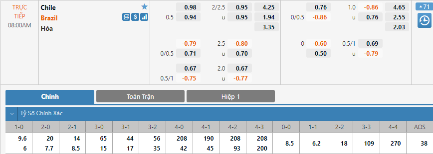 Ở bảng kèo tỷ số chính xác của trận đấu tỷ số 0-1 có điểm ăn thấp nhất với 6 lần. Tiếp theo là tỷ số hòa 1-1 với điểm ăn 6.2 lần, tỷ số 0-2 được duy trì ở mức 7.7 lần. Nhà cái cũng đánh giá khả trận đấu kết thúc với tỷ số 1-2 và 0-0 không quá thấp với cùng điểm ăn 8.5 lần. Nhưng với phán đoán Brazil vẫn có thể giành thắng lợi và trận đấu sẽ diễn ra không quá sôi nổi thì lựa chọn 0-1 hoặc 0-2 sẽ là lựa chọn tối ưu