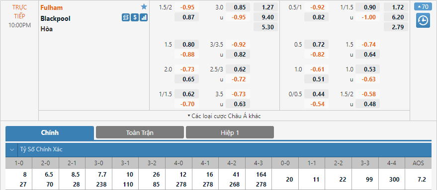 Ở bảng kèo tỷ số chính xác của trận đấu. Tỷ số 2-0 đang có điểm ăn thấp nhất với 6.5 lần, tiếp theo là tỷ số 3-0 với 7.7 lần. Tỷ số 1-0 và 2-1 có tỷ lệ ăn lần lượt là 8 và 8.6. Tỷ số 3-1 có lần ăn không mấy chênh lệch là 10 lần. Với dự đoán Fulham sẽ vượt kèo trận này và trận đấu sẽ diễn ra với một thể trận cởi mở thì có lẽ lựa chọn tỷ số 3-0 hoặc 3-1 sẽ là lựa chọn hợp lý.