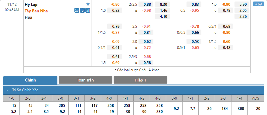 Hiện tại ở bảng kèo tỷ số chính xác của trận đấu. Tỷ số 0-1 và 0-2 đang có điểm ăn thấp nhất với 5.2 và 5.4 lần. Nhưng tỷ số 1-2 và 0-3 cũng không có nhiều chênh lệch với 8.5 lần ăn, với dự đoán Tây Ban Nha giành 3 điểm không dễ dàng thì lựa chọn tỷ số 0-1 hoặc 1-2 sẽ là lựa chọn hợp lý trận này