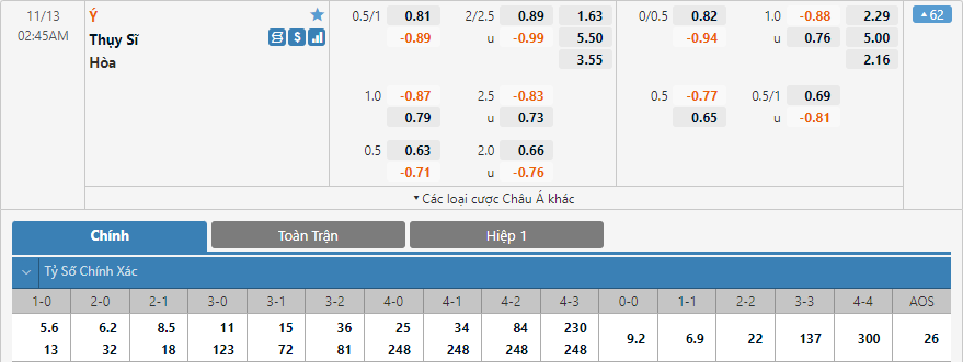 Ở bảng kèo tỷ số chính xác, tỷ số 1-0 và 2-0 đang có mức điểm ăn thấp nhất là 5.6 và 6.2 cho thấy nhà cái châu Á cũng đang nghiêng về dự đoán trận đấu sẽ diễn ra sôi nổi. Tỷ số 1-1 có mức điểm ăn không chênh lệch với 6.9 lần nhưng với dự đoán Italia nhiều khả năng giành 3 điểm trận này thì lựa chọn tỷ số 1-0 hoặc 2-0 sẽ là lựa chọn tốt.