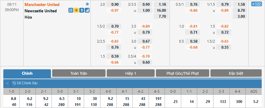 Ở bảng kèo tỷ số chính xác của trận đấu, tỷ số có mức ăn thấp nhất là 2-0 với 6.2 lần. Tiếp theo là tỷ số 3-0 và 1-0 với điểm ăn lần lượt là 6.5 và 8.8 lần. Tỷ số có lợi cho Newcastle có điểm ăn thấp nhất là tỷ số hòa 1-1 cũng có điểm ăn tới 14 lần. Với dự đoán khả năng thắng kèo cao của Man Utd và Newcastle không có nhiêu cơ hội ghi bàn thì có lẽ lựa chọn tỷ số 2-0 hoặc 3-0 sẽ là lựa chọn tốt cho trận đấu này.