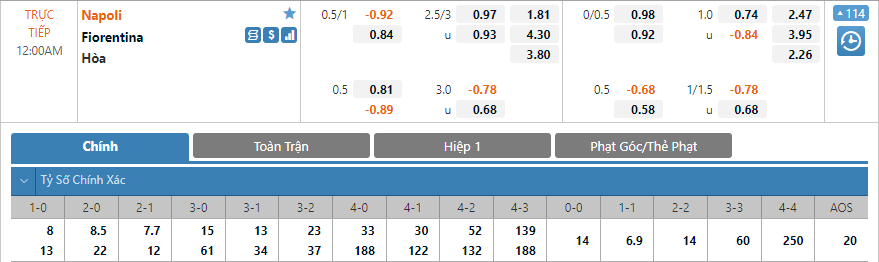 Ở bảng kèo tỷ số chính xác của trận đấu tỷ số hoà 1-1 đang có điểm ăn thấp nhất với 6.9 lần, tỷ số 2-1 tiếp theo với điểm ăn không quá chênh lệch là 7.7 lần, tỷ số 1-0 có điểm ăn là 8 lần. Với dự đoán Napoli có nhiều cơ hội chiến thắng nhưng sẽ là một chiến thắng vất vả thì lựa chọn tỷ số 1-0 hoặc 2-1 sẽ là một lựa chọn hợp lý.