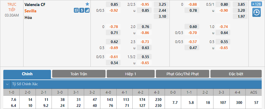 Trên bảng kèo tỷ số chính xác của trận đấu tỷ số hoà 1-1 đang có điểm ăn thấp nhất với 5.8 lần, tiếp theo là tỷ số 0-1 với 6.4 lần. Với dự đoán trận đấu sẽ có kết quả xỉu bàn thắng và Sevilla nhiều cơ hội giành 3 điểm thì có lẽ lựa chọn tỷ số 0-1 sẽ là một lựa chọn tốt.