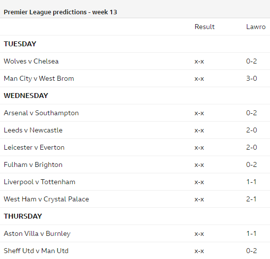 Cùng chuyên gia hàng đầu của BBC - Mark Lawrenson dự đoán kết quả các trận đấu thuộc vòng 13 giải Ngoại hạng Anh - Premier League.