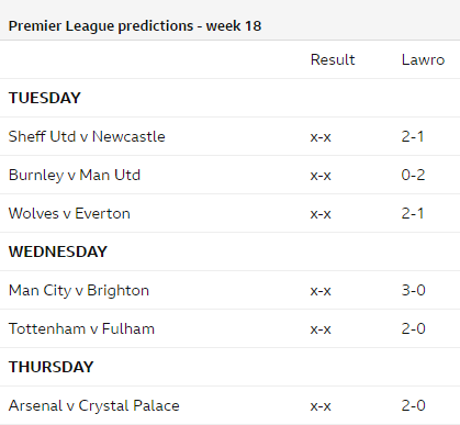 Cùng chuyên gia hàng đầu của BBC - Mark Lawrenson dự đoán kết quả các trận đấu thuộc vòng 18 và các trận đấu bù của giải Ngoại hạng Anh - Premier League.
