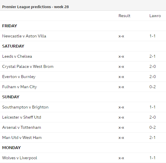 Cùng chuyên gia hàng đầu của BBC - Mark Lawrenson dự đoán kết quả các trận đấu thuộc vòng 28 giải Ngoại hạng Anh - Premier League.
