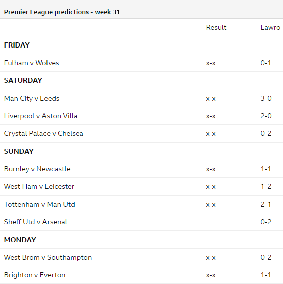 Cùng chuyên gia hàng đầu của BBC - Mark Lawrenson dự đoán kết quả các trận đấu thuộc vòng 31 giải Ngoại hạng Anh - Premier League.