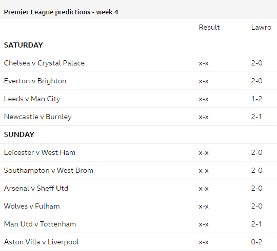 Cùng chuyên gia hàng đầu của BBC - Mark Lawrenson dự đoán kết quả các trận đấu thuộc vòng 4 giải Ngoại hạng Anh, Premier League.