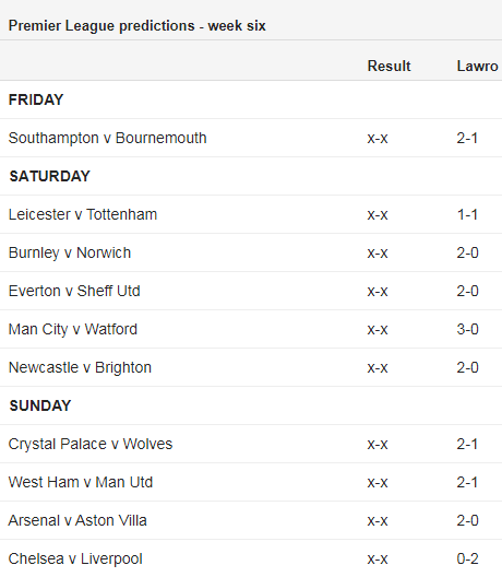 Cùng chuyên gia hàng đầu của BBC, Mark Lawrenson dự đoán kết quả các trận đấu thuộc vòng 6 giải Ngoại hạng Anh, Premier League.