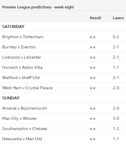 Cùng chuyên gia hàng đầu của BBC, Mark Lawrenson dự đoán kết quả các trận đấu thuộc vòng 8 giải Ngoại hạng Anh, Premier League.