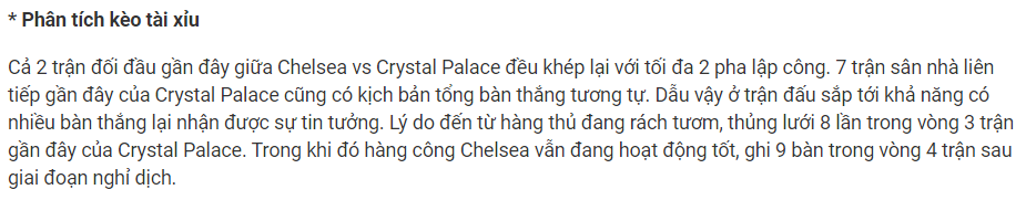 Trận đấu giữa Crystal Palace vs Chelsea, chuyên gia Đức Hưởng cũng sớm dự báo về xu hướng nổ Tài dù nhiều người tin rằng Chelsea sẽ thi đấu thực dụng để hướng tới việc giành 3 điểm: "Cả 2 trận đối đầu gần đây giữa Chelsea vs Crystal Palace đều khép lại với tối đa 2 pha lập công. 7 trận sân nhà liên tiếp gần đây của Crystal Palace cũng có kịch bản tổng bàn thắng tương tự.