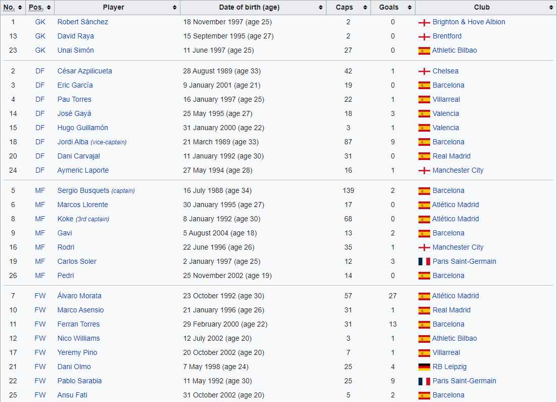 Trung vệ kỳ cựu Sergio Ramos cũng không có tên trong danh sách triệu tập mặc dù vẫn duy trì được phong độ tốt tại PSG, ngoài ra Thiago Alcantara cũng vắng mặt do không có phong độ tốt tại Liverpool. Tuy nhiên ĐT Tây Ban Nha vẫn có những ngôi sao như Dani Carvajal, Cesar Azpilicueta, Aymeric Laporte, Jordi Alba, Pedri, Sergio Busquets, Rodri, Koke, Ansu Fati trong đội hình.