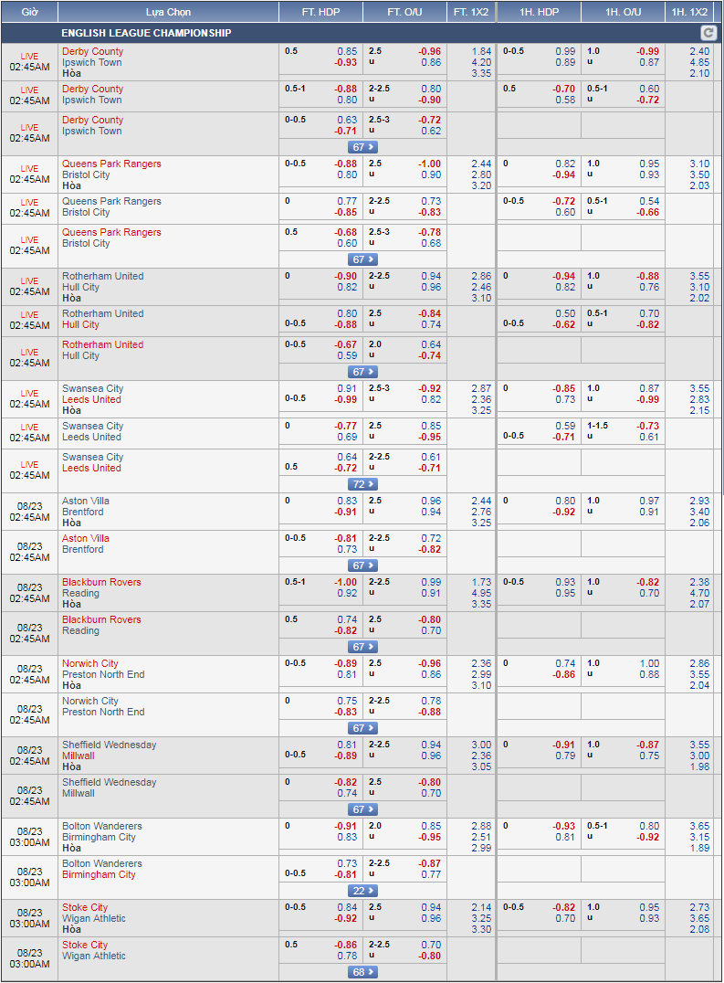 Trong khi đó Derby County sẽ có cuộc tiếp đón Ipswich trên sân nhà. Với sự xuất hiện của Frank Lampard cùng lợi thế sân nhà, Derby County được niêm yết ở mức tỷ lệ -3/4. Tuy nhiên, với việc mức chấp bị đánh hạ xuống chỉ còn -1/2 sau đó đang khiến cho niềm tin vào đội chủ sân Pride Park, trên thực tế đây cũng là điều dễ hiểu khi màn thể hiện của Derby City sau 3 vòng đấu vừa qua là khá tệ khi để thua tới 2 và chỉ có 1 chiến thắng, chưa kể thành tích đối đầuu tệ hại thời gian vừa qua.