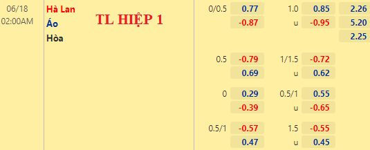 Việc Hà Lan được đánh giá cao hơn ở trận này không có gì khó hiểu. Tuy nhiên thì kèo hiệp 1 lại chưa cho thấy vị thế của "cơn lốc màu da cam". Handicap cả trận chấp 1 hòa nhưng hiệp 1 Hà Lan chỉ chấp đồng banh. Mặc dù đã thắng trận mở màn nhưng phải đến hiệp 2 Hà Lan mới chọc thủng lưới Ukraine.