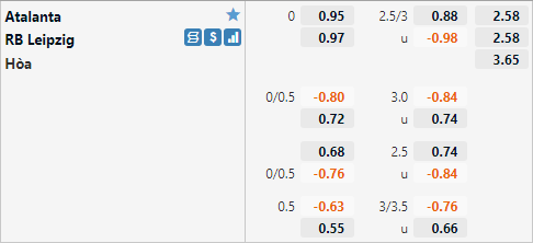 Ở trận đấu này với lợi thế sân nhà Atalanta được nhà cái đánh giá tương đồng với đối thủ bằng tỷ lệ 0:0. Đây là mức Handicap hợp lý khi Leipzig được đánh giá cao hơn với tỷ lệ chấp 3/4 ở trận đấu lượt đi. Với mức tỷ lệ này có thể thấy cơ hội của hai đội là tương đương có lẽ việc lựa chọn kèo Handicap không dễ dàng.