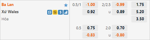Với lợi thế sân nhà ĐT Ba Lan đang có tỷ lệ chấp 3/4 trên sàn giao dịch châu Á. Ở lần tiếp đón Wales gần nhất diễn ra từ năm 2005 ĐT Ba Lan đã có tỷ lệ chấp 1 1/4. Với mức chấp 3/4 trận này có thể thấy nhà cái châu Á đang đánh giá rất cao đội chủ nhà bởi theo xếp hạng FIFA họ chỉ đứng thứ 26 trong khi Wales hiện tại đang giữ vị trí thứ 18.