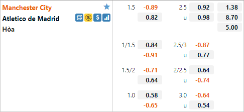 Mức tỷ lệ chấp này cho thấy giới chuyên môn cũng không đánh giá quá thấp khả năng có điểm của Atletico Madrid trận này. Mặc dù không được lực lượng tốt hơn đối thủ nhưng Atletico Madrid vẫn là đội bóng có nhiều kinh nghiệm thi đấu tại các giải đấu châu lục. Thời gian gần đây Atletico cũng đã có phong độ ổn định hơn và chắc chắn họ sẽ tạo ra không ít khó khăn cho Man City với lối chơi phòng ngự.