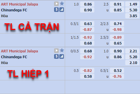 Trên sàn giao dịch châu Á hiện tại ART Municipal Jalapa đang có tỷ lệ chấp chấp 1 hoà và mức điểm ăn tương đối cân bằng. Trong khi đó ở tỷ lệ hiệp 1 nhà cái đang niêm yết 2 tỷ lệ rất khó cho người chơi, một tỷ lệ ART Municipal Jalapa chấp 1/4 nhưng mức điểm rất thấp còn lại là một tỷ lệ chấp 1/2 với điểm bỏ cũng tương đối sâu. Rõ ràng việc chọn lựa tỷ lệ chấp 1/2 là khá mạo hiểm trận này.