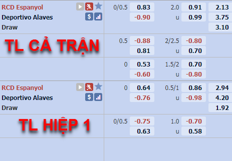Mặc dù được gần như đều được đánh giá cao hơn đối thủ nhưng Espanyol không nhiều lần có lợi thế trước đối thủ sau hiệp 1 khi tiếp đón Alaves, cụ thể họ chỉ thắng kèo hiệp 1 đúng 1 lần sau tổng cộng 6 lần đối đầu với Alaves trên sân nhà. Ở hoàn cảnh hiện tại thì tỷ lệ 0:0 hiệp 1 trận này là tỷ lệ hợp lý khi Espanyol đang rơi vào khủng hoảng. Không dễ để đội chủ nhà có thể giành lợi thế trước đối thủ ở 45 phút đầu tiên.
