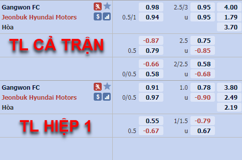 Tỷ lệ tài xỉu của trận đấu đang được nhà cái châu Á công khai ở mức 2 3/4. Đây là mức tỷ lệ tương đối cao so với mặt bằng chung của K League. Gangwon không có thành tích tốt ở 3 vòng đấu nhưng phong độ của họ không quá tồi tệ, ở phía bên kia mặc dù Jeonbuk Motors đang đứng đầu BXH nhưng họ không phải là đội bóng ghi nhiều bàn thắng nhất. Tính tới thời điểm này đội khách ghi được 5 bàn thắng sau 3 vòng đấu. Với những thống kê trên có thể thấy giới đầu tư trên sàn giao dịch đang có nhiều nghi ngờ về tỷ lệ 2 3/4 nhà cái đưa ra cho trận đấu vào lúc này.