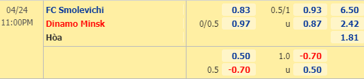 Với việc kèo cả trận Dinamo Minsk chấp hòa thì hiệp 1 họ chấp 1/4 cũng hoàn toàn hợp lý. Dẫu chơi chưa thực sự thuyết phục thì CLB của thủ đô vẫn là cái tên có "sức nặng", giàu truyền thống hơn rất nhiều so với Smolevichi. Sở dĩ Dinamo Minsk chưa chấp quá sâu bởi màn trình diễn từ đầu mùa của họ chưa gây được niềm tin cho giới chuyên môn.