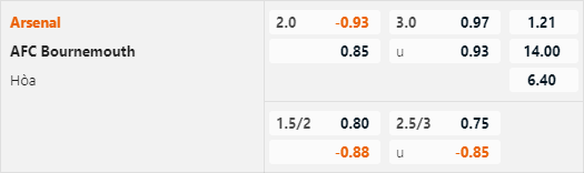Với lợi thế sân nhà và phong độ vượt trội Arsenal đang có tỷ lệ chấp chính 2 hoà trên sàn giao dịch châu Á. Đây là mức chấp cao của Arsenal so với các cuộc đối đầu gần đây. 2 trận đấu tương tự gần nhất các pháo thủ chỉ có tỷ lệ chấp 1 1/4 khi tiếp đón Bournemouth.