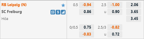 Hiện tại trên sàn giao dịch châu Á Leipzig được nhà cái đánh giá ở cửa trên với tỷ lệ chấp 1/2 và điểm ăn bỏ cho trận đấu này. Ở cuộc đối đầu gần nhất diễn ra trên sân của Freiburg Leipzig cũng có tỷ lệ chấp 1/2, điều này cho thấy giới chuyên môn không đánh giá cao Leipzig bởi đáng ra Leipzig phải có tỷ lệ chấp tốt hơn khi thi đấu trên sân trung lập.