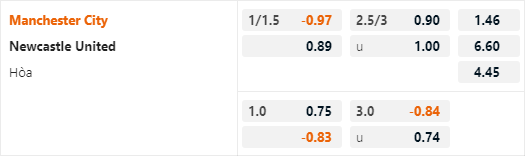Trên sàn giao dịch châu Á hiện tại Man City duy trì vị trí cửa trên với tỷ lệ chấp 1 1/4 trận này. Đây là mức chấp tương đối thấp của đội chủ nhà nếu so sanh với các cuộc đối đầu trong quá khứ, cụ thể thi đây là lần đầu tiên kể từ năm 2010 các cầu thủ Man City có tỷ lệ chấp thấp hơn 1 1/2 khi tiếp đón Newcastle trên sân nhà.