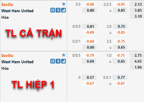 Tỷ lệ hiệp 1 trận đấu Sevilla đang có tỷ lệ chấp 1/4 và mức điểm bỏ tương đối sâu, mức tỷ lệ này cho thấy nhà cái đánh giá Sevilla khó có được lợi thế ngay trong 45 phút đầu tiên của trận đấu. Theo những thống kê gần đây thì Sevilla chỉ có 3/8 trận đấu ghi được bàn ngay trong hiệp 1, trong khi West Ham cũng không ghi được bàn thắng nào ở hiệp 1 trong 3 trận đấu gần nhất. Với lối chơi chắc chắn hiện tại của Sevilla nhiều khả năng đội chủ nhà sẽ nhập cuộc thận trọng do đó khả năng hiệp 1 trận đấu kết thúc với tỷ số hoà 0-0 là rất cao.