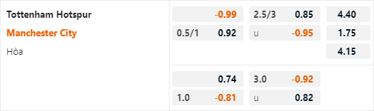 Hiện tại nhà cái châu Á đang công khai mức chấp 3/4 của Man City cho trận đấu này. Có thể thấy đây là mức chấp thấp hơn so với mức chấp 1 hoà của Man City trong trận đấu tương tự của mùa giải trước. Điểm đáng chú ý là Tottenham luôn bị đánh giá thấp hơn đối thủ nhưng họ mới là đội có thành tích tốt hơn khi thắng cả 4 lần tiếp đón Man City gần nhất.