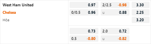 Chelsea được nhà cái đánh giá ở cửa trên với tỷ lệ chấp 1/4 trận này. Cuộc đối đầu tương tự của mùa giải trước các cầu thủ Chelsea đã có tỷ lệ chấp 3/4, điều này cho thấy giới chuyên môn đang nghi ngờ khả năng thắng của Chelsea trận này. Bởi hiện tại không phải mỗi Chelsea mà West Ham cũng không duy trì được lối chơi ổn định.