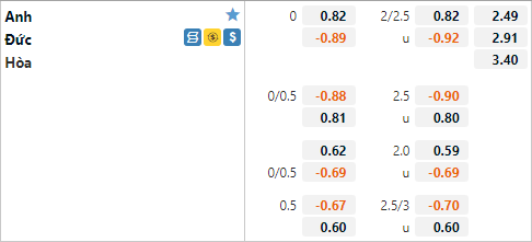 Với lợi thế sân nhà ĐT Anh được nhà cái đánh giá nhỉnh hơn đối thủ đôi chút với tỷ lệ 0:0 và mức điểm ăn ít bên phía đội chủ nhà. Có thể thấy với mức tỷ lệ này ĐT Đức đang bị đánh giá tương đối thấp, ở lần làm khách của ĐT Anh gần nhất cỗ xe tắng Đức đã có tỷ lệ chấp 1/2 trên sàn châu Á. Nhưng mức tỷ lệ 0:0 là hợp lý thời điểm hiện tại khi ĐT Đức thể hiện không tốt ở 3 trận vòng bảng.