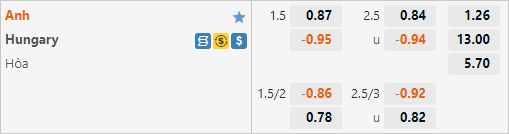 Đội tuyển Anh với lợi thế sân nhà đang được nhà cái châu Á đánh giá rất cao với tỷ lệ chấp 1 1/2 trên sàn giao dịch châu Á. Mức chấp này là tương đối thấp khi ở lần tiếp đón Hungary gần nhất tại vòng loại WC 2022 ĐT Anh đã có tỷ lệ chấp tới 2 1/4, thậm chí nếu so ngay cả với cuộc đối đầu vừa qua trên đất Hungary thi đây vẫn là mức tỷ lệ chấp tương đối thấp khi ĐT Anh đã có tỷ lệ chấp 1 hoà trên sân khách.