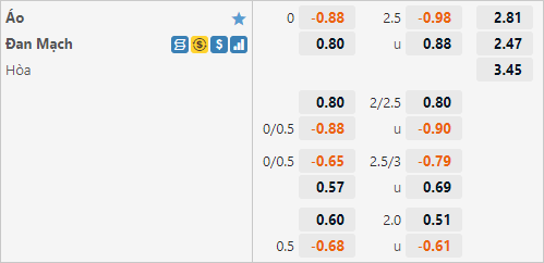 Có thể thấy với lối chơi cởi mở hiện tại và hiệu suất ghi bàn tương đối tốt của cả hai bên (Áo ghi 6 bàn sau 3 trận trong khi Đan Mạch ghi 7 bàn/3 trận). Về lý thuyết thì khả năng trận đấu này diễn ra sôi nổi với nhiều bàn là rất cao nhưng nhà cái lại đưa ra mức tài xỉu tương đối thấp, điều này đang tạo ra không ít nghi ngờ trên thị trường. Có lẽ lựa chọn cửa xỉu trận đấu này chưa chắc đã là một lựa chọn mạo hiểm.