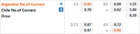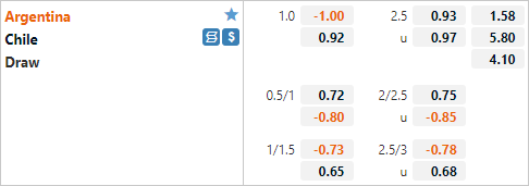Trên sàn giao dịch châu Á hiện tại ĐT Argentina có tỷ lệ chấp 1 hoà và mức điểm ăn tương đối cân bằng. Đây là tỷ lệ chấp tương đối cao của ĐT Argentina. Ở lần đối đầu gần nhất diễn ra trên sân trung lập năm 2019 ĐT Argentina chỉ có tỷ lệ chấp 1/4 và họ cũng không thể vượt qua rao cản do nhà cái đặt ra khi chỉ có được kết quả hoà 0-0. Nhưng điều này cũng dễ hiệu khi ĐT Chile đã có màn trình diễn đáng thất vọng trong lần tập trung thi đấu vòng loại WC diễn ra cuối năm trước.