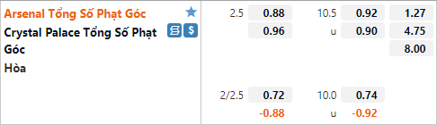 Thời gian gần đây lối chơi của Arsenal cũng đem về cho nhiều tình huống phạt góc, đặc biệt là khi họ được thi đấu trên sân Emirates. Cụ thể là 4 sân nhà của mùa giải này Arsenal đã có tổng cộng 31 tình huống phạt góc (trung bình gần 8 tình huống phạt góc 1 trận). Với Crystal Palace 2/3 trận đấu gần nhất của họ cũng ghi nhận nhiều tình huống phạt góc. Nhưng với dự đoán trận đấu sẽ diễn ra với một kịch bản cởi mở thì lựa chọn cửa xỉu phạt góc chưa chắc đã là một lựa chọn mạo hiểm bởi hai đội sẽ có nhiều phương án tấn công khác thay vì treo bóng từ hai cánh trong một thế trận mở.