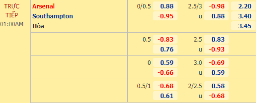 Nhìn qua thì mức tài xỉu 2 3/4 nhà cái đưa ra cho trận này có vẻ cao, nhưng thực tế điều đó chẳng có gì bất ngờ khi 4/6 trận gần đây của Arsenal cùng 3 vòng vừa qua của Southampton đều xuất hiện tối thiểu 3 lần lưới rung. Trong bối cảnh như vậy, AEGoal còn cho rằng mức tài xỉu như vậy còn là thấp, lẽ ra phải là 3 hòa trở lên mới hợp lý.