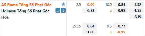 Tỷ lệ tài xỉu phạt góc của trận đấu được công khai ở mức 10 hòa, đây là mức cao nếu nhìn vào quá khứ đối đầu của hai đội. Chỉ có 1 trong 4 cuộc đối đầu gần nhất ghi nhận nhiều hơn 10 tình huống phạt góc. Những trận đấu gần đây của Udinese cũng có kết quả tương tự, 9 trận đấu chính thức gần nhất của đội khách không có trận nào ghi nhận nhiều hơn 9 tình huống phạt góc. Với dự đoán AS Roma sẽ có những tình toán thức dụng ở trận đấu này thì khả năng trận đấu có ít tình huông phạt góc hoàn toàn có thể xảy ra khi đội chủ nhà được dự đoán là đội chiếm ưu thế trên sân.