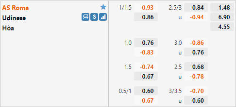 Với lợi thế sân nhà và lực lượng tốt hơn AS Roma đang được nhà cái đánh giá cao hơn với tỷ lệ chấp 1 hòa và điểm ăn ít. Với tỷ lệ chấp 1 hòa ở trận đấu này Roma đang được đánh giá cao hơn khi họ chỉ có tỷ lệ chấp 3/4 ở trận đấu tương tự của mùa giải trước. AS Roma cũng không gặp nhiều khó khăn khi tiếp đón Udinese, họ thắng 7 sau 8 lần tiếp đón Udinese gần nhất