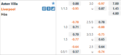 Với lực lượng vượt trội Liverpool đang có tỷ lệ chấp 1 1/4 trên sàn giao dịch châu Á. Ở trận đấu tương tự gần nhất của giải Ngoại hạng Anh Liverpool cũng đã có tỷ lệ chấp 1 1/4 nhưng ở trận đấu đó họ đã gây thất vọng khi bất ngờ thất bại trước Aston Villa với tỷ số 2-7. Mặc dù luôn ở vị thế cửa dưới nhưng Aston Villa đang có thành tích tốt khi tiếp đón Liverpool, đội chủ nhà đã thắng 2/3 trận đấu gần nhất với cùng cách biệt 5 bàn.