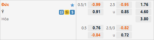 ĐT Đức được nhà cái đanh giá ở cửa trên với tỷ lệ chấp 3/4 trên sàn giao dịch châu Á. Đây là mức chấp tương đối thấp của đội chủ nhà, ở trận đấu lượt đi ĐT Đức đã có tỷ lệ chấp 1/2 khi phải thi đấu sân khách. Quá khứ không ủng hộ các cầu thủ Đức khi họ chỉ thắng được Italia 1/10 cuộc đối đầu gần nhất.