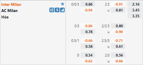 Hiện tại Inter Milan đang có tỷ lệ chấp 1/4 trên sàn giao dịch châu Á, có thể thấy tỷ lệ của nửa xanh thành Milan đang có xu hướng giảm khi họ đã có tỷ lệ chấp 1/2 ở thời điểm tỷ lệ trận đấu bắt đầu được công khai trên sàn giao dịch châu Á. Mặc dù hiện tại Inter Milan luôn được đánh giá cao hơn kình địch nhưng họ chỉ giành được chiến thắng 1/4 cuộc đối đầu gần nhất diễn ra trong năm 2021 và 2022.