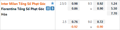 Tỷ lệ tài xỉu phạt góc của trận đấu đang được nhà cái duy trì ở mức 9 1/2. Đây là mức tài xỉu tương đồng với mặt bằng chung của giải đấu và không có điều gì bất thường. Theo thống kê trong quá khứ thì 3 cuộc đối đầu gần nhất đều kết thúc với nhiều hơn 12 tình huống phạt góc được ghi nhận. 2/3 trận đấu gần nhất của Inter Milan cũng có kết quả tài phạt góc. Nhưng với dự đoán trận đấu này có kịch bản sôi nổi thì rất có thể sẽ không có nhiều tình huống phạt góc. Bởi với thế trận cởi mở thì hai đội đều sẽ có rất nhiều lựa chọn để tiếp cận khung thành đối phương thay vì treo bóng từ 2 cánh hay dứt điểm từ xa.