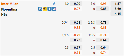 Inter Milan đang được nhà cái châu Á đánh giá ở cửa trên với tỷ lệ chấp 1 hoà và điểm ăn ít cho trận đấu này. Đây cũng là mức tỷ lệ chấp thường thấy của Inter Milan trong quá khứ đối đầu. Ở trận đấu tương tự của mùa giải trước Inter Milan cũng có tỷ lệ chấp 1 hoà nhưng đội chủ nhà đã không thể vượt kèo khi chỉ có được chiến thắng 4-3.