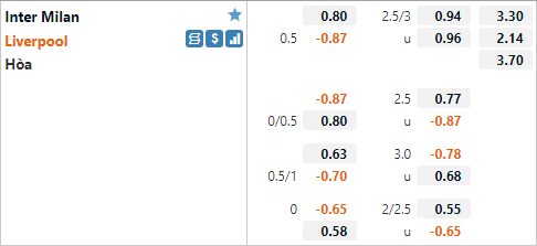 Mặc dù có lợi thế sân nhà nhưng Inter Milan bị đánh giá yêu hơn đối thủ khi được Liverpool chấp với tỷ lệ 1/2 trên sàn giao dịch châu Á. Ở cuộc đối đầu tương tự diễn ra tại Champions League mùa giải 2007-2008 đại diện nước Anh cũng có tỷ lệ chấp 1/2 và họ đã có chiến thắng tối thiểu 1-0, kết quả vừa đủ giúp Liverpool vượt qua rào cản do nhà cái châu Á đặt ra.